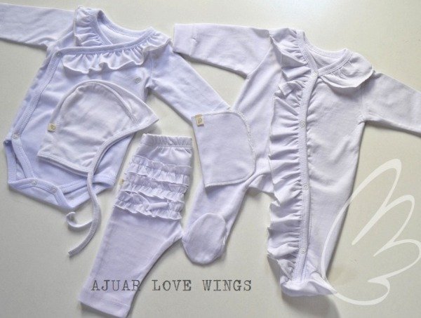 El Ajuar Love Wings para bebé está compuesto por 5 piezas imprescindibles para el cuidado de tu pequeño: body manga larga, ranita, enterito, gorro y babita. Todo confeccionado en algodón peinado blanco, un material suave y cómodo, ideal para la delicada piel de los bebés.
